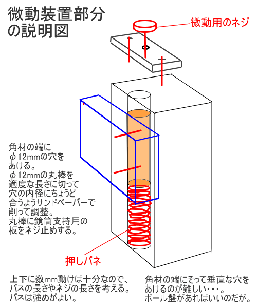 今回作ってみた微動装置の造りを、左図に示しました。鏡筒上下式顕微鏡の微動装置を上下逆にしたような構造です。簡単な工具しか持っていないし、材料も木材なので、このくらいが限界でした(金属加工の技術や工具類があれば、もっと精度の高い微動装置を自作できるような気がします。押しネジの部分を「てこ」を使って減速するとか・・・)。