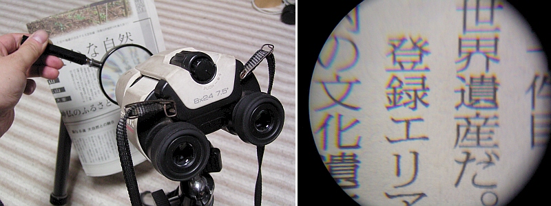 双眼鏡でなくてもいいわけですね。単眼鏡でも同じことです。要するにクローズアップレンズを付けた状態なんですね。これで15倍くらいの倍率かな。虫メガネの代わりにルーペに押し付けると、さらに倍率がアップします。色消しタイプのクローズアップレンズなどがあれば、さらによく見える顕微鏡が作れそうです。