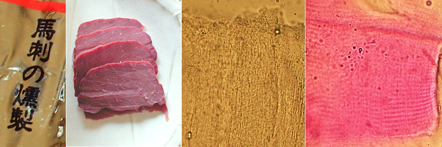 おみやげでもらった「馬刺の燻製」です。馬の肉ですね。脂が少なくて、ブタのハムなんかより「筋肉」らしい感じがします?。美味しいです。
